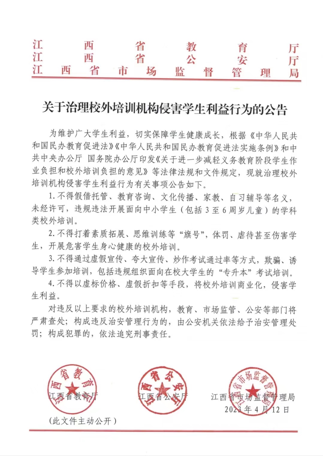 关于治理校外培训机构侵害学生利益行为的公告