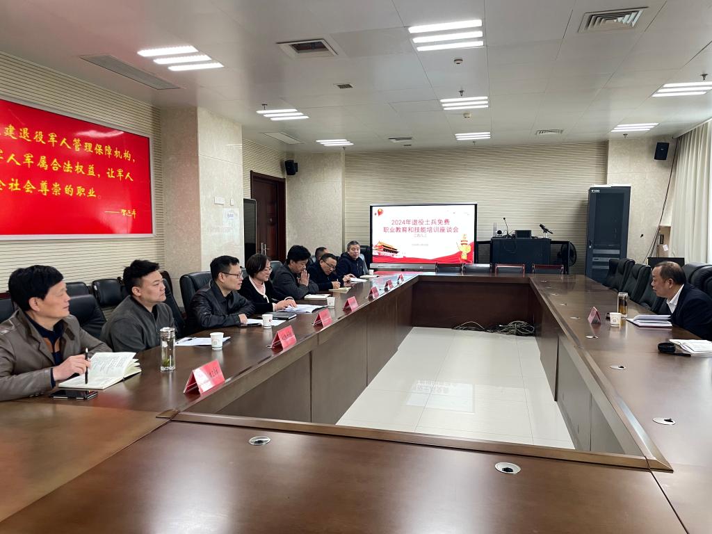 2024年3月20日上午,九江市退役军人事务局召开2024年退役士兵免费职业教育和技能培训座谈会,全市7所承训机构工作人员参会。九江市退役军人事务局副局长陶建敏主持会议,我院党委副书记卢小澍、培训办主任仲伟佳参会。