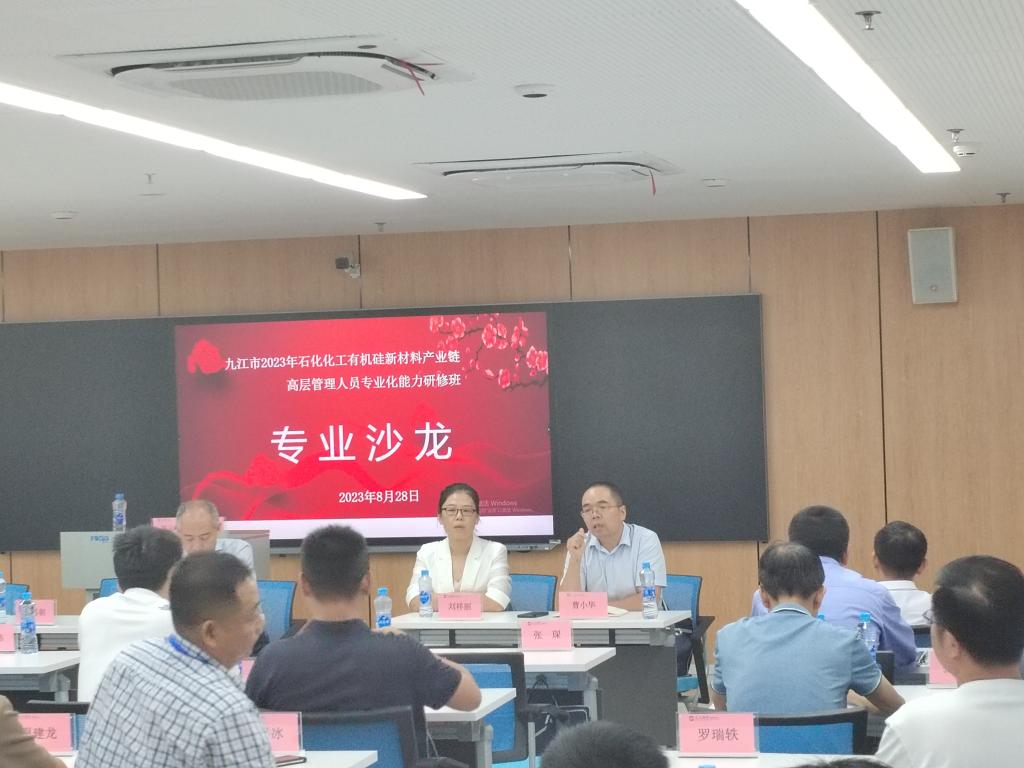 8月28日—30日,由九江市工信局,77779193永利官网集团、化学化工学院在九江银行研学中心举行了三场石化化工——有机硅新材料产业链高层管理人员专业学术沙龙活动。来自九江石化产业园区、彭泽矶山化工园区等全市化工园区的管委会主任、江西理文化工有限公司、江西心连心化学工业有限公司、九江善水化工科技股份有限公司等石化化工和有机硅新材料企业的负责人、湖北和安徽省辅助配套企业等企事业单位的主要负责人与永利集团化学化工学院、资源环境学院的教授博士等100余人参与了沙龙讨论。并先后特邀中国石油和化学工业联合会化工新材料专业委员会秘书长卜新平、陕西科技大学安秋凤教授、华东理工大学江先龙教授级高工三位专家与研修班学员进行了面对面的交流互动。