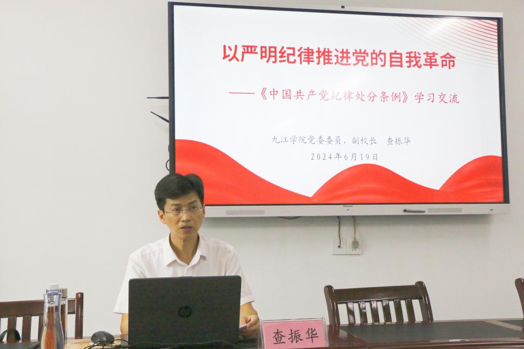 查振华以“以严明纪律推进党的自我革命”为题,从纪律严明是党的光荣和独特优势、《中国共产党纪律处分条例》修订的主要特点、坚持严明纪律推进党的自我革命等三个方面进行辅导。讲座主题鲜明、思想深刻、内容丰富、指导性强,准确聚焦学校实际情况进行分析,对推动我院党纪学习教育走深走实和推进学院继续教育高质量发展具有很强的指导意义。结合党纪学习教育和继续教育工作,他提出了几点要求。一是要按照党纪党规开展工作,寻找工作中存在的风险点并制定防范措施,既要发展也要合规;二是要在非学历教育培训上下功夫,充分发挥学校高层次人才队伍优势,为九江区域经济发展提供服务。