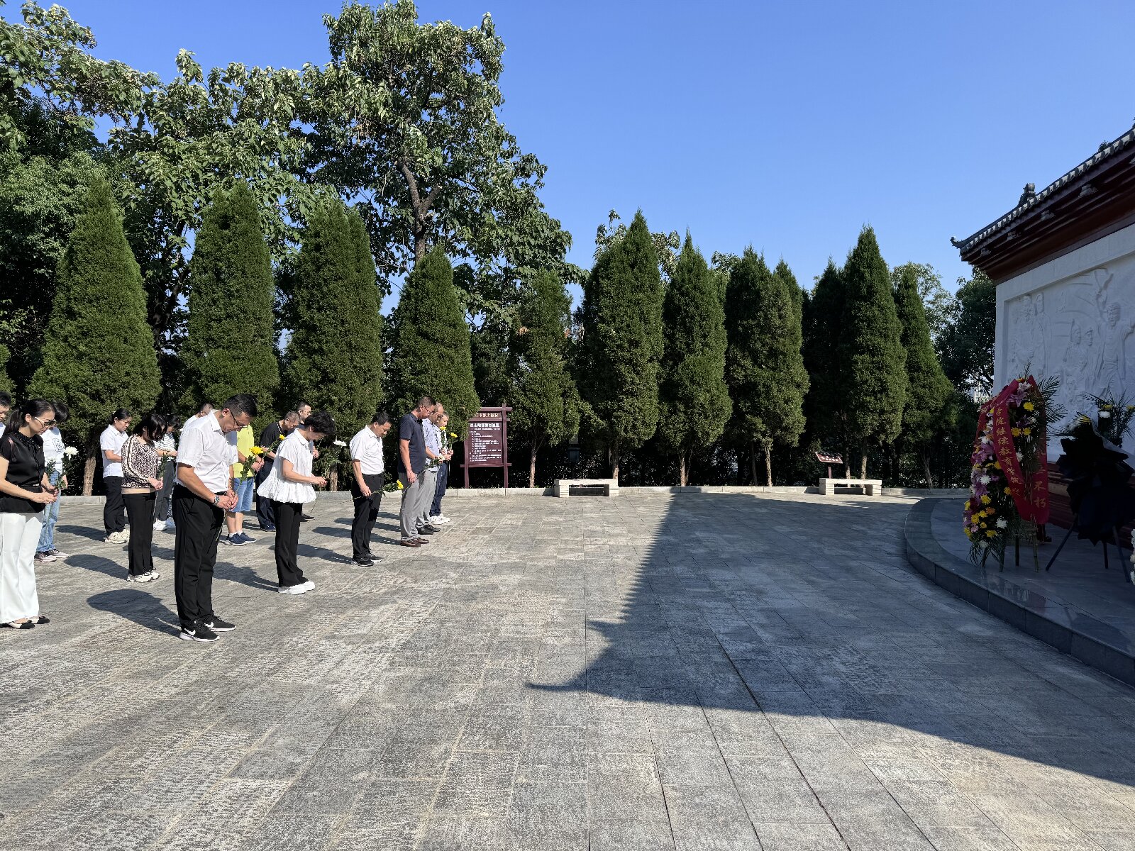 上午9时许,全体教职工怀揣着无比崇敬的心情,齐聚烈士纪念碑前开展缅怀仪式,深切缅怀革命先烈。教职工代表手捧鲜花编织而成的花篮,步伐庄重地将其抬至烈士纪念墙前,以表达对革命先烈的深切怀念与崇高敬意。随后,大家面向纪念碑,为那些为民族独立、国家解放和人民幸福英勇献身的烈士们,深深鞠躬三次,并静默一分钟,以此缅怀他们不朽的英勇事迹与崇高精神,深切感受历史赋予的沉重与对英雄的无限哀思。在肃穆的氛围中,大家依次缓步向烈士敬献鲜花,瞻仰烈士纪念墙、烈士墓。